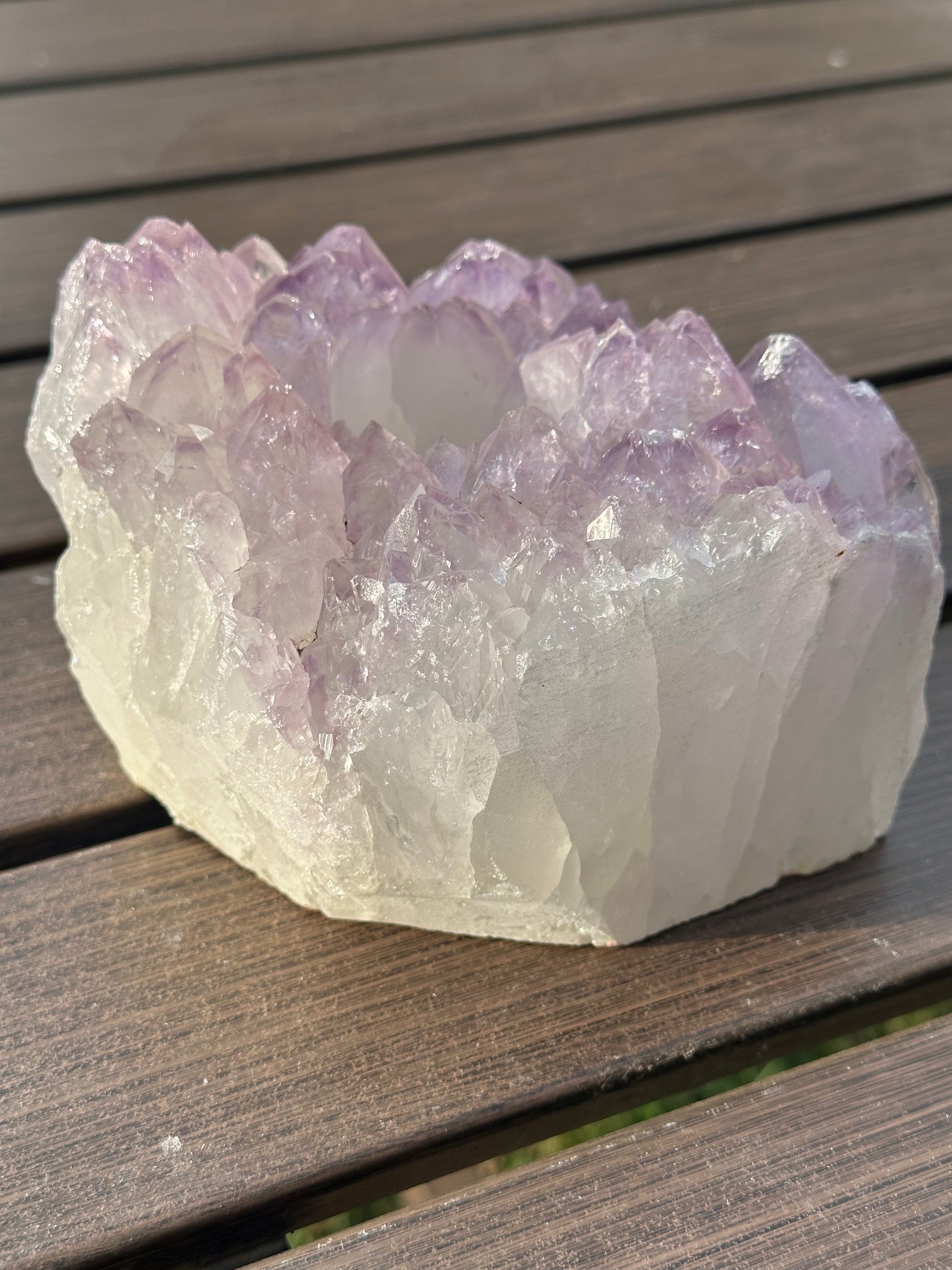 Large Amethyst Votive holder with felted bottom to prevent scratching on furniture. Approximately 6” wide by 4” tall.